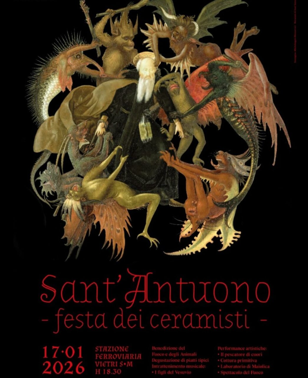 I ceramisti infatti onorano quello che da sempre è il loro Santo Patrono, Antonio Abate, conosciuto localmente come Sant’Antuono. Era usanza antica infatti che in quel giorno i proprietari delle “faenzere” (le antiche fabbriche di ceramica) preparassero un pranzo luculliano per i propri dipendenti, usanza che poi è stata istituzionalizzata, trasformandosi in un vero e proprio rito arricchito da celebrazioni religiose in onore dei ceramisti scomparsi, mostre a tema e, soprattutto, dalla benedizione di quello che è l’elemento sacro per ogni artigiano: il fuoco.