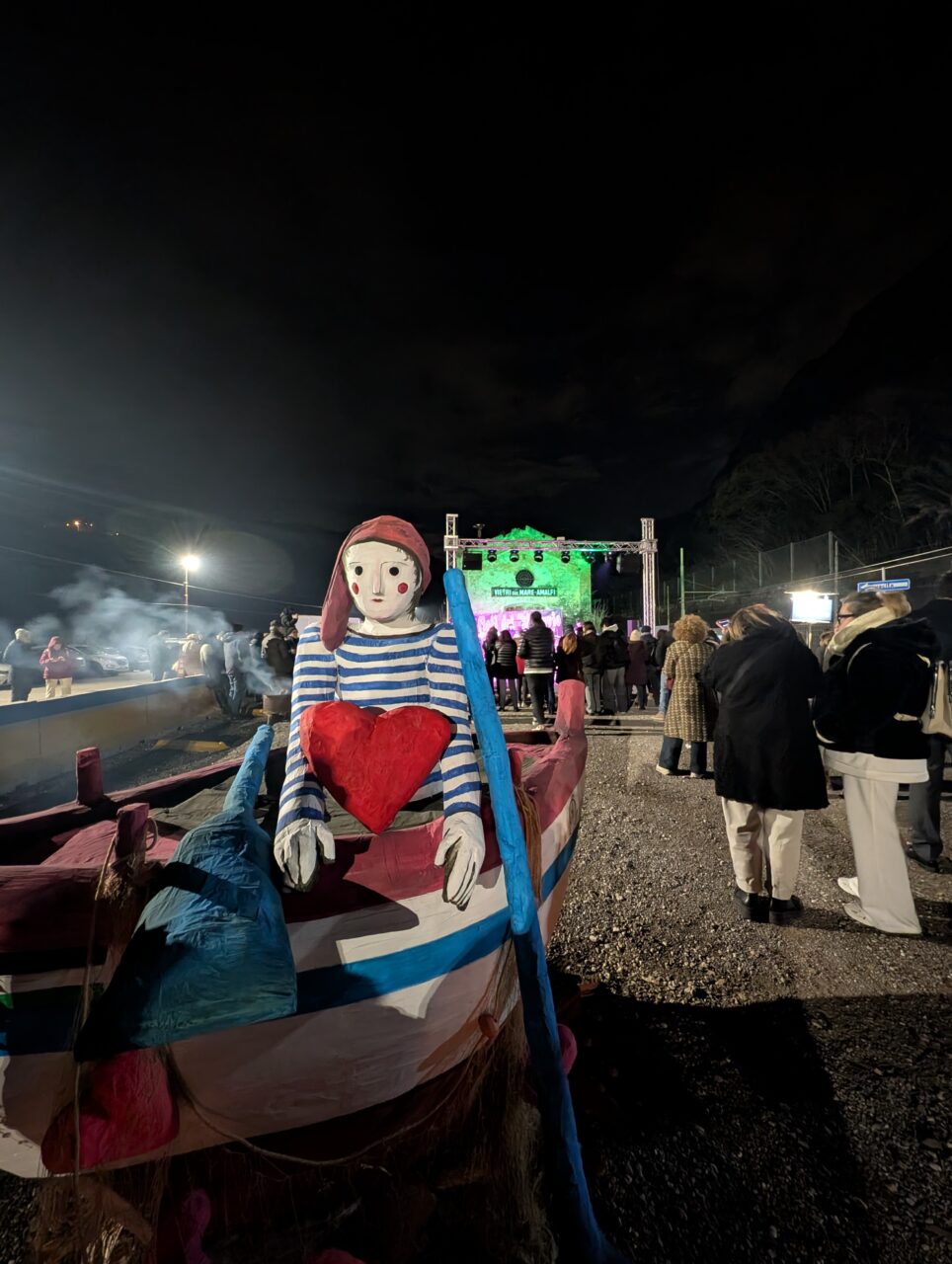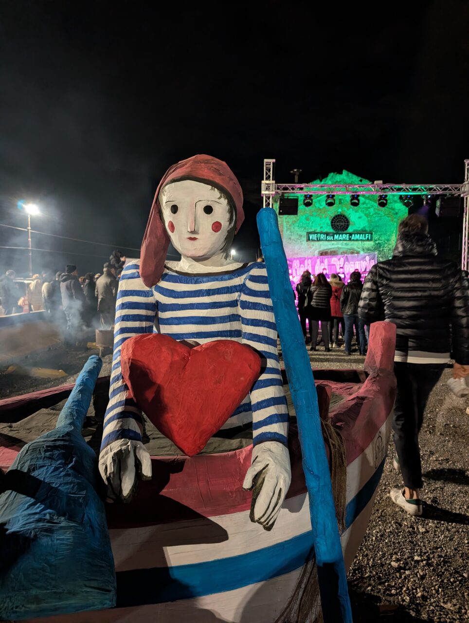 Dopo la benedizione, le fiamme prendono vita davanti agli occhi del pubblico: da alcuni anni, infatti, si è instaurata la suggestiva consuetudine di incendiare una scultura in cartapesta (il ciuccio vietrese nel 2024 e la Sirena di Irene Kowaliska, realizzata da Elisabetta d’Arienzo, nel 2025). Le fiamme avvolgono lentamente le forme, illuminando la notte e creando un momento di forte impatto emotivo, quasi rituale.